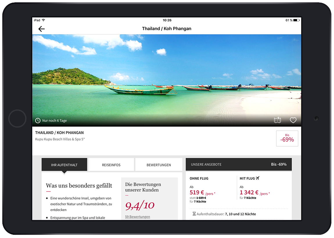 Voyage Privé bietet seinen Mitgliedern sog. Flash Sales, oder auch Reise-Deals für Luxus-Reisen, Flüge, Hotels und andere Events an. Dabei verhandeln unsere Einkäufer für Sie die besten Preise. Die Reise-Deals können unsere Mitglieder während eines Zeitraums von 7-11 Tage auf unserer Webseite buchen. So können wir Ihnen exklusive Reisen bis zu -70% anbieten. Diese Ermäßigung ist dabei exklusiv nur für unsere Mitglieder verhandelt, weswegen auch nur eingeloggte Voyage Privé Mitglieder Zugang zu unseren Reiseangeboten bekommen.
