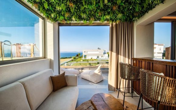 Für einen Hauch von Luxus, zusätzlichen Komfort und absolute Privatsphäre entscheiden Sie sich für die Premium Suite mit Privatpool. Diese helle und sehr moderne Unterkunft mit sanften Farben und einer bepflanzten Decke wird Ihr Rückzugsort der Ruhe sein. Am Abend, bevor Sie einschlafen, können Sie in Ihrem eigenen Pool relaxen und von Ihrem Balkon aus das Meer bewundern.