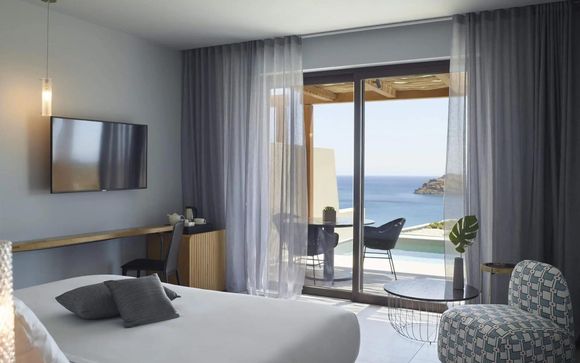 Genießen Sie stilvolle Entspannung in diesem elegant designten Superior Zimmer mit Meerblick mit maßgefertigten Betten und herrlichem Blick auf die Insel Spinalonga. Luxuriöse Marmorbäder, stimmungsvolle Farben und eine private Veranda schaffen eine Atmosphäre voll Ruhe und Komfort – ideal für erholsame Auszeiten.