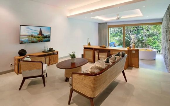 Entspannen Sie in Ihrer großzügigen und luxuriösen Suite mit Waldblick. Hell und elegant gestaltet, lädt sie Sie zu entspannten Momenten ein – nach erlebnisreichen Tagen unter der balinesischen Sonne.
