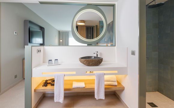 Genießen Sie einen herrlichen Blick auf das Meer und den Pool, den Sie von Ihrem Balkon aus bequem von einer Sonnenliege aus bewundern können. Die Junior Suite mit Meerblick wird Sie auch mit ihrer zeitgenössischen und künstlerischen Einrichtung überraschen.