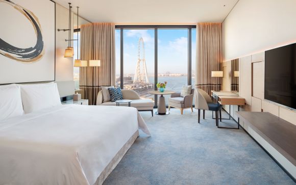 Träumen Sie wie im siebten Himmel in Ihrem Kingsize-Bett und genießen Sie absoluten Komfort im Deluxe Zimmers mit Meerblick. Sie erwachen jeden Morgen mit einem wunderbaren Blick auf das Meer und das berühmte Ain Dubai.